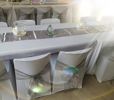 Ajoutez une note de couleur et raffinée à votre réception en habillant vos chaises de ce nœud en organza gris clair.